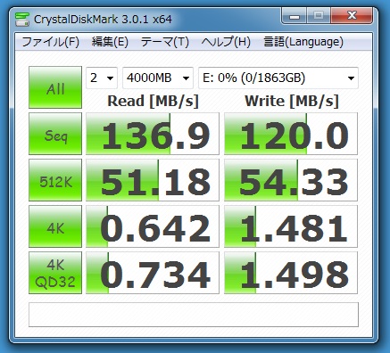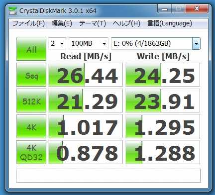 今回ラシージャパン様より4Big Quadraと2Big Quadraの2台のストレージをお借りすることが出来ましたのでこちらのハードディスクがどの程度までの映像編集に耐えられるのかを検証していきます。まず4Big Quadraをヒューレット・パッカード社 HP xw4600 Workstationに接続してみました。ところが最初から認識しません。営業担当さんの話では繋ぐだけで認識して使えるようになるから難しい設定は必要無いという事だったのですが・・・という事でこちらの検証はあきらめて2Big Quadraから検証していきます。2Big Quadraはアルミの放熱羽のデザインが美しい2台のハードディスクを内蔵したタイプのストレージです。フロントの丸い窓が何のためにあるのか気になるところですがこちらはボタンとなっています。接続方式は最大150MB/sの転送速度を持つE-SATA接続にて行います。Raidの設定はストレージの転送速度を最大限に引き出せるfast(Raid 0)に設定してあります。PCと接続して2Big Quadraの電源をAUTOに切り替えてからHP xw4600 Workstationを立ち上げると2Big Quadraの電源スイッチを操作しなくても自動的に電源がオンになりました。WindowsXPのディスクの管理よりNTFSでファーマットするとハードディスクボリュームが追加されております。ストレージの電源はPCの電源と連動して入り切りされるようです。これは便利ですね。2Big Quadraは初期設定にてHFS+フォーマットされておりWindowsXPを使っていれば繋いでフォーマットするだけで使えるようになります。MACを使っていれば特別な設定は何も必要ありません。営業担当さんの言うとおり繋ぐだけで使えるようになります。CrystalDiskMarkというハードディスクの能力を測るソフトを使用して検証した結果、データの読み込みが105.0 MB/s データの書き込みが103.3 MB/sとなり平均20MB/s程度(可変ビットレート)のカノープスHQコーデックのデータを複数トラック同時再生させることが可能であるという事がわかります。実際に編集機に接続して使ってみますと弊社のCore i7のCPUを積んだモデルでピクチャーインピクチャーで4トラック~5トラックの同時表示再生にてタイムスケールの色がオレンジ色(負荷部分)を保っておりCPUの能力しだいではもう少しトラックを増やしても対応できる可能性を秘めております。次に立方体のデザインがモダンアートのような趣の4台のハードディスクを内蔵した4Big Quadraを何とか使えるように設定していきたいと思います。届いた付属品の中にDVDディスクが1枚入っておりましたのでドライバーか設定ソフトがあるのかと調べてみます。しかしニュアルとバックアップデータ作成ソフトしか入っておりません。そこで改めて取扱説明書を読んでみると「Windows XP 32 ビットおよび Windows 2000 は、2TB を超えるボリュームに対応していません。Windows XP x64、Windows Server 2003 SP1 および Windows Vista Enterprise/Ultimate (32 ビットおよび 64 ビット バージョン) には対応していますが、2TB を超えたボリュームを作成するには、ディスクを GPT ファイル システムに変換することが必要です。」との記載が見つかりました。4TBの容量を持つ4Big QuadraはそのままではXPで認識できなかったのです。そこで弊社のVISTAのインストールされたPCで接続確認を行ってみます。ところがここでさらに問題発生!なんとこのPCにはE-SATA端子がありません。こんな時にも慌てずに4Big Quadraの背面をチェックすると何と、このストレージはE-SATA、FireWire 800、FireWire 400、USB 2.0と4種類もの接続方式に対応しています。とりあえずUSB 2.0で接続してみると何の問題も無く認識しました。ラシージャパンの営業担当さんストレージの初期不良を疑ってゴメンなさい。ストレージには何の問題もありませんでした。認識しなかった原因はWindows XPの仕様によるものでした。しかしこのままではWindows XPで使用する事が出来ません。あきらめてVISTA専用ストレージとして販売するしか無いのでしょうか・・・しかもXP環境で4Big Quadra VS 2Big Quadra対決として転送速度の比較もしてみたい・・・そこで改めて困ったときの頼みの綱である取扱説明書を読み直します。するとハードディスクの容量を減らす方法が見つかりました。単純に4TBの容量が減るだけでは困りますが4Big QuadraではRaid機能を使ってデータのバックアップを取りつつ転送速度もアップさせるRaid 10というモードがあります。これでストレージの容量を2TBに変更する事が可能です。Raidモードの変更はパソコンを使わずにストレージの裏にあるダイヤルの番号を選択したいRaidのモードに合わせて正面のボタンを押しつつ電源スイッチを入れさらに正面のボタンを2秒以上押し続けるという簡単な方法です。パソコンを立ち上げてディスクの管理より新しいボリュームの作成とフォーマットをするとこれで4Big QuadraがXPでも使えるようになりました。こちらもCrystalDiskMarkというハードディスクの能力を測るソフトでチェックしてみましょう。データの読み込みが138.1 MB/s データの書き込みが112.4 MB/sとなりデータのバックアップ作業